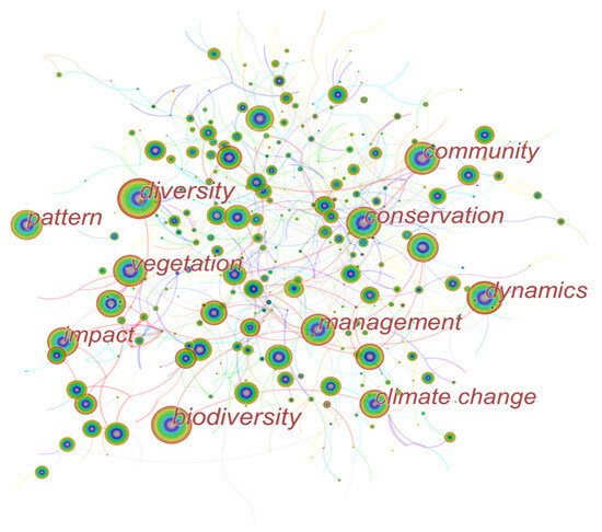 The keywords with ≥316 occurrences were diversity (580), biodiversity (537), conservation (419), management (408), vegetation (385), dynamics (372), patterns (370), communities (336), impact (320), and climate change (316) (Figure 7). Owing to their high frequency, these keywords were regarded as virtual nodes in the network. These critical nodes covered the main contents of international forest ecological benefit compensation research. First, starting from “forest biodiversity”, “how to protect”, and “how to manage”, scholars have carried out research on forest ecological benefit compensation around these starting points. Second, scholars set “forest growth pattern”, “ecosystem services”, “communities”, “climate change”, and “impacts” as the main research directions. Third, the “dynamics” keyword comes into view. It is predicted that scholars will pay more attention to the dynamic changes in forest ecological benefit compensation or in the research impetus to promote the evolution of forest ecological benefit compensation.