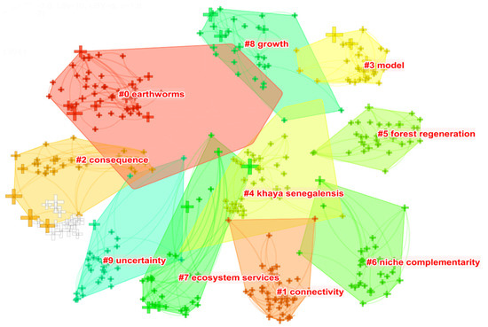 The keywords for forest ecological benefit compensation research could be clustered into ten categories: earthworms, connectivity, consequence, model, Khaya cenogenesis, forest regeneration, niche complementarity, ecosystem services, growth, and uncertainty (Figure 8). They were sorted from 0–9, with a smaller number indicating that the cluster contained more keywords. Multiple closely related words formed each cluster, in which keywords were explicitly used in “Cluster Explorer” using the logarithmic likelihood rate (one of the cluster label word extraction algorithms) algorithm to produce the keyword co-occurrence network cluster table (Table 6).