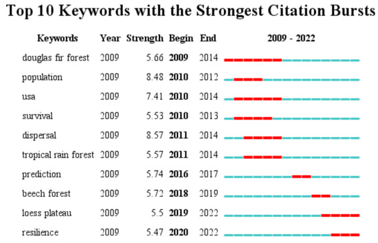 “Dispersibility” was the term with the greatest outbreak intensity value of 8.57 from 2009–2022; this term suddenly emerged in 2011 and was then terminated in 2014 (Figure 9). The actual context of this period is that the United Nations had designated 2011 as the International Year of Forests, with the theme of “Forests for the People”, which aimed to arouse public awareness of environmental protection, promote activities such as forest protection, development, and management on a global scale, and give full play to the critical role of forests in fostering sustainable economic and social development. Taking forests as the research object, the essential role of ecological filtering and dispersal limitations in species coexistence is discussed.