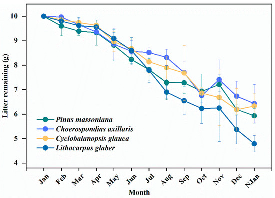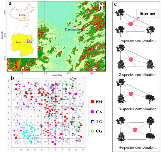 - Ge, J.L.; Xie, Z.Q.; Xu, W.T.; Zhao, C.M. Controls over leaf litter decomposition in a mixed evergreen and deciduous broad-leaved forest, Central China. Plant Soil 2016, 412, 345–355. [Google Scholar] [CrossRef]