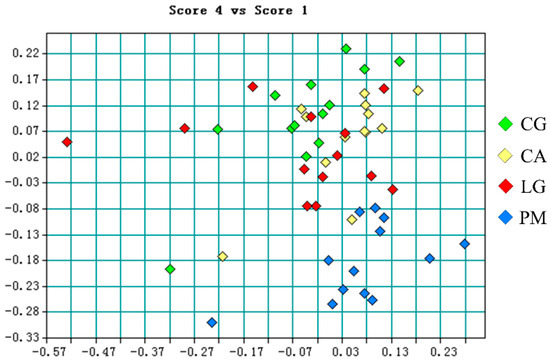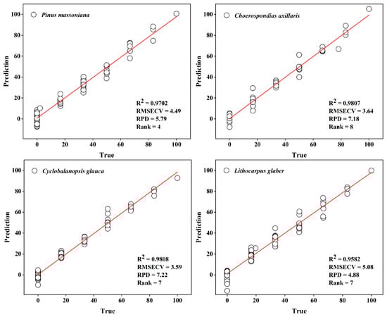 - The four component tree species—Pinus massoniana Lamb., Choerospondias axillaris (Roxb.) Burtt et Hill, Cyclobalanopsis glauca (Thunb.) Oerst. and Lithocarpus glaber (Thunb.) Nakai—are different in chemical composition and spectral performance, and they are also different from the mineral soil on the surface of the forest floor in chemical composition. Therefore, the NIRS model can be used to separate and predict the composition of the foliage mixtures of four tree species.