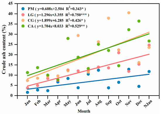 3.3. Influence of Litter Decomposition Rate and Crude Ash Content over Time