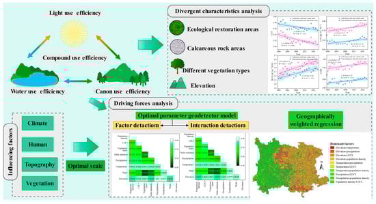 Ecosystem carbon use efficiency (CUE), water use efficiency (WUE), and light use efficiency (LUE) are critical parameters for estimating CO2 uptake, water circulation, and ecosystem balance. Research on the change trends of individual use efficiency has matured; however, studies on the spatiotemporal heterogeneity and driving mechanisms of divergence patterns for multi-use efficiencies capability are limited. Therefore, taking southwest China as an example, this study constructed a compound use efficiency (COM) through CUE, WUE, and LUE. Based on the spatiotemporal patterns and divergence characteristics analysis of water–carbon–light use efficiencies, the scale effects and driving mechanism of its divergence characteristics for COM at the optimal scale were clarified. The results revealed that the average value of CUE, LUE, WUE, and COM were 0.49, 0.7 gC m−2 MJ−1, 2.31 gC kg−1 H2O, and 0.87, respectively. Apart from CUE, the LUE, WUE, and COM parameters exhibited a fluctuating upward trend. Statistically, there was a high COM in karst and ecological restoration regions, reflecting the strong adaptability of karst vegetation and the effectiveness of ecological restoration; as the elevation rose, COM increased and then decreased, with the highest value at the elevation of 3000 m; the lowest COM was found in grassland, refuting the inference that it can be used as an optimal vegetation type for China’s Grain to Green program from the perspective of use efficiency. Sub-basin was the most optimal divergence scale, and although temperature and elevation were the dominant single force causing COM divergence, the couplings of precipitation and population density and elevation and population density had more controlling impacts than a single force. These findings enrich the understanding of ecosystem use efficiency and are beneficial for the improvement in ecological restoration strategies in karst landscapes.