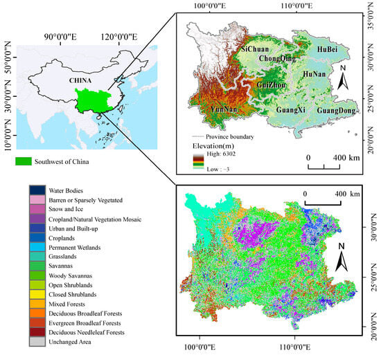The study region, situated in the southwestern part of China, encompasses eight provinces (Sichuan, Chongqing, Yunnan, Guizhou, Hunan, Hubei, Guangdong, and Guangxi). The topography of the region is characterized by a high northwest and low southeast trend (Figure 2), with a complex and diverse landscape comprising mountains, plateaus, basins, hills, and plains. The monsoon climate and topographic factors have resulted in a diverse climate in this region, which is dominated by a highland climate, tropical seasonal rainforest climate, and subtropical monsoon climate from west to east. Moreover, the region features extensive carbonate rock formations, predominantly composed of limestone and dolomite. The phenomenon of rock desertification stands as a prominent land deterioration problem, with vast tracts of previously vegetated terrains having transitioned into barren stone expanses [,]. As a critical carbon sink and an exemplar of ecological sensitivity, the rejuvenation of vegetation in this region has attracted considerable focus.