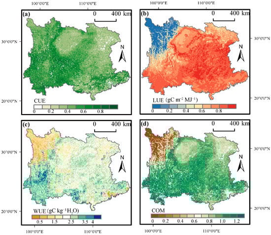 Multi-year average values of ecosystem (a) CUE, (b) LUE, (c) WUE, and (d) COM in southwest China from 2000–2018.