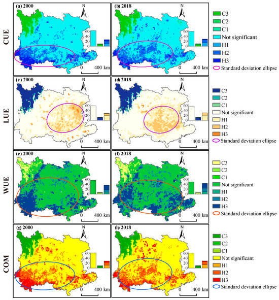 From 2000 to 2018, the hotspots of CUE, WUE, and COM were all clustered in the southwest of the study area, such as Yunnan, Guangxi, Guizhou, and northern Guangdong (Figure 4). Hotspots for LUE were primarily found in the eastern region of the study area, such as Guizhou, Hunan, and Guangxi. Compared with 2000, in 2018, the area ratios of hotspot areas for CUE, LUE, WUE, and COM increased from 26.91%, 28.67%, 37.65%, and 28.88% to 29.25%, 30.48%, 44.53%, and 30.73% of the entire area, respectively. The LISA clustering map (Figure S5) accurately represents regions of high and low values for the two-by-two combinations of use efficiency. In 2000 and 2018, for the carbon–light use efficiencies, the high–high value clusters were located mainly in Yunnan and Guizhou, while the low–low value clusters were mainly located in western Sichuan, the Sichuan Basin, and northern Hubei. The spatial divergence of carbon–water has a similarity with carbon–light, the high–high clusters predominated in Yunnan, while western Sichuan, the Sichuan Basin, Hubei, and Hunan were primarily characterized by low–low clusters. The high–high value clusters for light–water were located in southwestern Yunnan, Hunan, Guizhou, and northern Guangxi, and the low–low value areas were identified in western Sichuan.