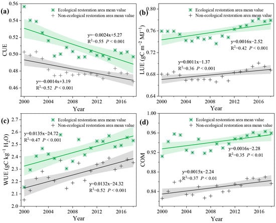 Inter-annual mean ecosystem (a) CUE, (b) LUE, (c) WUE, and (d) COM change trend from 2000–2018 in ecological restoration and non-ecological restoration areas.
