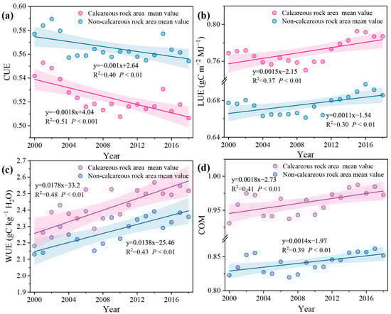 Inter-annual mean ecosystem CUE, LUE, WUE, and COM change trend from 2000–2018 in calcareous rock and non-calcareous rock distribution areas.