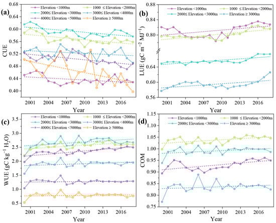 Inter-annual mean ecosystem (a) CUE, (b) LUE, (c) WUE, and (d) COM change trends from 2000–2018 of different elevations.