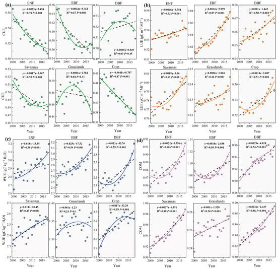 Inter-annual mean ecosystem (a) CUE, (b) LUE, (c) WUE, and (d) COM change trend from 2000–2018 of different vegetation types. DBF: deciduous broadleaf forest; EBF: evergreen broadleaf forest; and ENF: evergreen needleleaf forest.