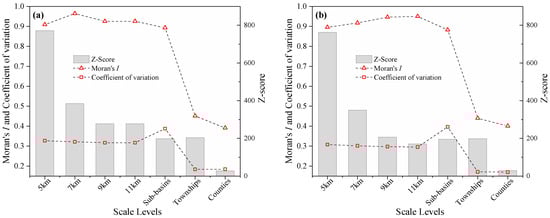 To further estimate the influence of scale change on the COM, the descriptive statistical parameters at various scale levels were analyzed by spatial data exploration method (Figure 9). The Z-Score at a 7-level scale was greater than 1.96, indicating a significant spatial clustering of COM (p < 0.05). The spatial autocorrelation Moran’s I values of COM at the sub-basin unit scale were 0.89 and 0.88 in 2000 and 2018, respectively, which were closer to that calculated at the grid unit scale and more pronounced than at the township and county unit scale levels. Meanwhile, the coefficients of variation at the sub-basin unit scale were the highest in the 7-level scale, at 0.39 and 0.4, respectively. Thus, the sub-basin scale was informative in terms of spatial variation in COM, which was a characteristic scale for southwest China.