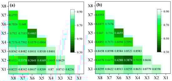In reality, intricate environmental processes exhibit interactions, and factors are often interdependent []. The interaction detector was utilized to measure the intensity of connections among various elements. This information proves valuable in quantifying the extent of influence that interacting factors have on the COM [].