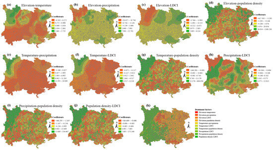 Spatial regression coefficients of two-factor coupling with COM. (a) elevation–temperature, (b) elevation–precipitation, (c) elevation–LDCI, (d) elevation–population density, (e) temperature–precipitation, (f) temperature–LDCI, (g) temperature–population density, (h) precipitation–LDCI, (i) precipitation–population density, (j) population density–LDCI, (k) dominant factors.