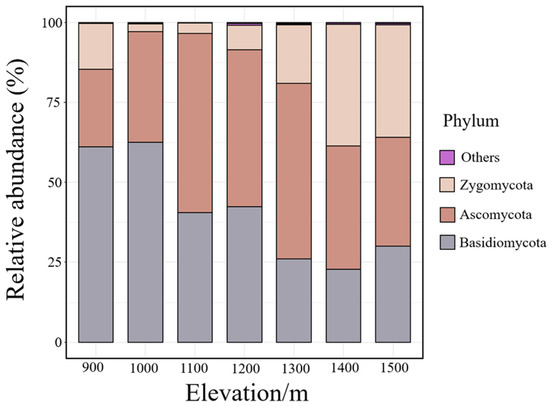 The dominant soil fungal composition at the phylum level along the elevational gradient.