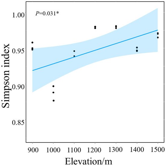 Soil fungal α-diversity (Simpson’s index) along the elevational gradient. The solid blue line represents the fitted curve of soil fungal α-diversity and seven elevations, the blue area represents the confidence interval of 95%, and the black dots represent observed data points. * indicates p < 0.05.