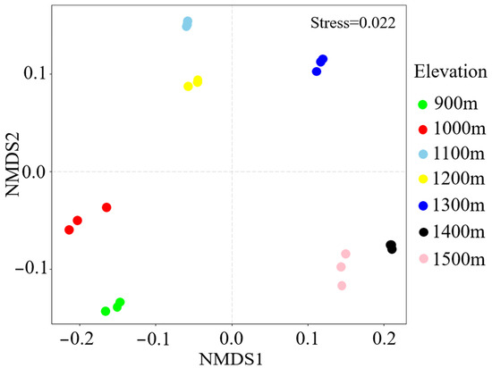 Based on the hypothesis that soil fungal diversity exhibited a moderate expansion trend within the range of 1200–1300 m. In the study of soil fungal communities in forest ecosystems, this work involved identifying the top 10 phylum with the highest abundance at each sample or clustering level, calculating relative abundance, and generating bar accumulation plots. These steps aligned with the expected similar patterns, indicating a moderate expansion of soil fungal diversity within the designated elevation range. Permanova (Permutational Multivariate Analysis of Variance) analysis based on the Bray-Curtis distance was conducted using the ‘adonis’ function from the ‘vegan’ package, which is a widely utilized tool for analyzing ecological and biodiversity data [26]. This method was used to investigate differences in soil fungal community structure along the elevational gradient. Furthermore, the application of non-metric multidimensional scaling (NMDS) helped assess the differences in dominant soil fungal community structures at different elevations through the Permanova method and helped precisely quantify the contribution of influencing factors to explain the diversity of soil fungal communities, thereby reinforcing the hypothesis of elevation-related diversity patterns [26,27].