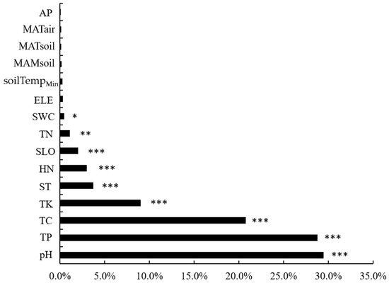 Interpretation rate of different factors to the β-diversity of dominant soil fungal communities. The significance level was * p < 0.05; ** p < 0.01; *** p < 0.001. Notes: AP: soil available phosphorus; MATair: mean annual air temperature; MATsoil: mean annual soil temperature; MAMsoil: mean annual soil moisture; soilTempMin: minimum soil temperature; ELE: elevation; SWC: soil water content; TN: soil total nitrogen; SLO: slope; HN: hydrolysable nitrogen; ST: soil temperature; TK: soil total potassium; TC: soil total carbon; TP: soil total phosphorus; and pH: soil pH.