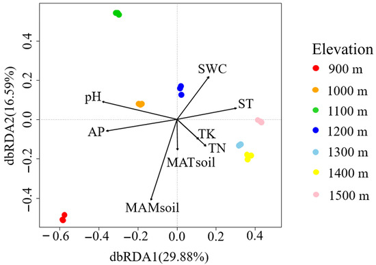 Redundancy discrimination analysis (dbRDA) of soil fungal communities along the elevational gradient. Note: ST: soil temperature; SWC: soil water content; TK: soil total potassium; TN: soil total nitrogen; AP: soil available phosphorus; MATsoil: mean annual soil temperature; MAMsoil: mean annual soil moisture; and pH: soil pH.