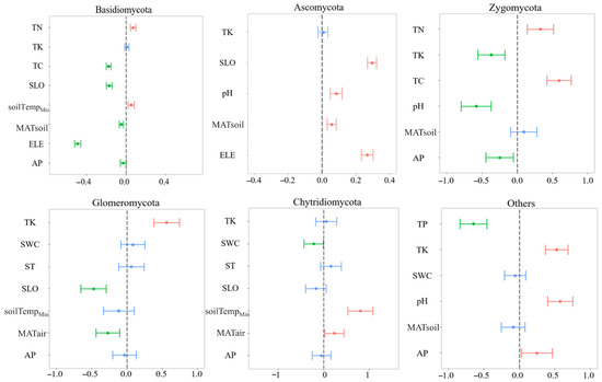 Tests of significance between the environmental factors and dominant soil fungal communities at the phylum level. Note: The green line, red line, and blue line represent the negative impact, positive impact, and no significant impact, respectively, and the abscissa represents a 95% confidence interval. MATair: mean annual air temperature; MATsoil: mean annual soil temperature; soilTempMin: minimum soil temperature; ELE: elevation; SWC: soil water content; SLO: slope; ST: soil temperature; TN: soil total nitrogen; TK: soil total potassium; TC: soil total carbon; TP: soil total phosphorus; pH: soil pH; and AP: soil available phosphorus.