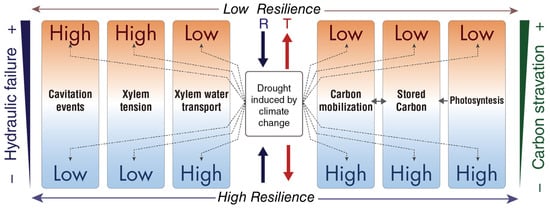 Conceptual framework summarizing physiological mechanisms or processes that induce hydraulic failure and carbon starvation in trees and affect the resilience of forests and/or mortality of trees in drought scenarios induced by climate change. Extreme processes are noted, with the best conditions for each mechanism shown in the lower part of the diagram and the worst conditions shown in the upper part. R is Rainfall (mm); T is Temperature (°C).