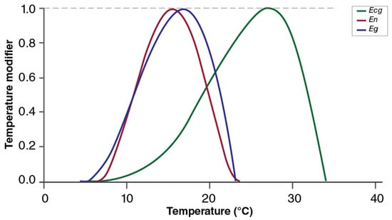 Air temperature response function for Eucalyptus globulus (Eg, blue line), Eucalyptus nitens (En, red line), and Eucalyptus camaldulensis x globulus hybrid (Ecg, green line) species. The temperature modifier scales the maximum potential daily tree growth according to daily mean temperature (adapted from Watt et al. []).