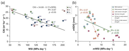 (a) Water stress integral (WSI) and current annual increment (CAI) relationship for Eucalyptus globulus (Eg, blue dots), E. nitens (En, red dots), and E. nitens x globulus (Eng, green dots) genotypes. Different genotypes are indicated by a number after taxa (adapted from Oliveira et al. []). (b) Monthly water stress integral (mWSI) and monthly stem diameter growth (mSDG) evaluated for juvenile Pinus radiata trees (2 years old). Adapted from Waghorn et al. [].