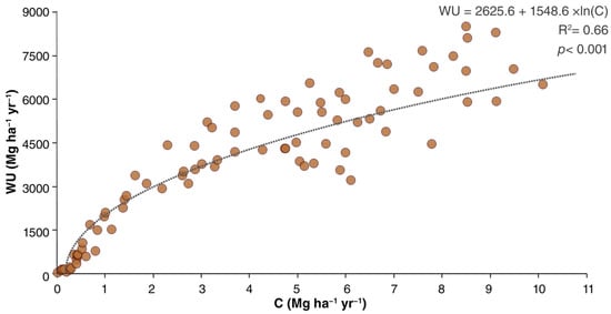 Relationship between site aboveground C fixation and water use (WU) estimated by Rubilar et al. [] and published information from studies considering a range of different forest species worldwide (see Table S1 for details).
