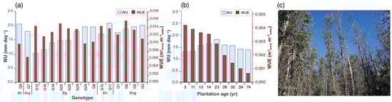 (a) Stand water use (WU) and water use efficiency (WUE) for a range of Mediterranean Eucalyptus sp. genotypes and hybrids growing under experimental conditions. In order from left to right: E. badjensis (Eb), E. camaldulensis × globulus (Ecg), E. globulus (Eg), E. nitens (En), and E. nitens × globulus (Eng). (b) WU and WUE for an age range of plantations (based on references indicated in Table S1). (c) Top site productivity for E. nitens family genotype, showing sudden mortality at six years of age under short-term drought at Eucahydro experimental site (details in Rubilar et al. []).