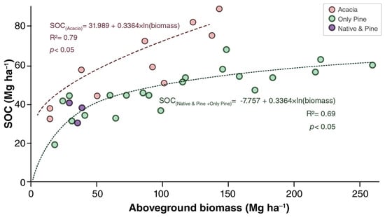 Soil organic Carbon (SOC) and aboveground biomass accumulation in degraded abandoned soils from agriculture established or colonized by Acacia dealbata (Acacia, red dots), native species with Pinus radiata (Native & Pine, purple dots), and Pinus radiata (Only Pine, green dots). Similar patterns of SOC are observed for non-N fixing species compared to invasive Acacia species, adapted from Rubilar et al. [].
