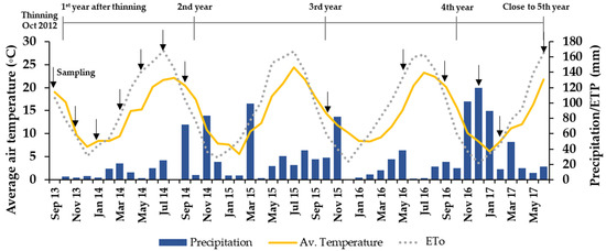 - Bautista, I.; Lidón, A.; Lull, C.; González-Sanchis, M.; del Campo, A.D. Thinning decreased soil respiration differently in two dryland Mediterranean forests with contrasted soil temperature and humidity regimes. Eur. J. For. Res. 2021, 140, 1469–1485. [Google Scholar] [CrossRef]