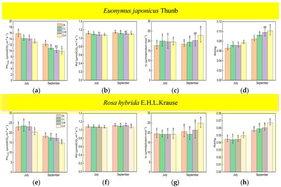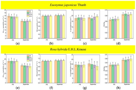 Effects of light intensity on Pnmax, Rd, lc, and Rd/Ag of Euonymus japonicus Thunb (a–d) and Rosa hybrida E.H.L.Krause (e–h) under non-continuous ALAN. Different lowercase and capital letters within the columns indicate significant differences among the treatments at p < 0.05 in July and September, respectively. Data are mean values ± SDs (n = 6).