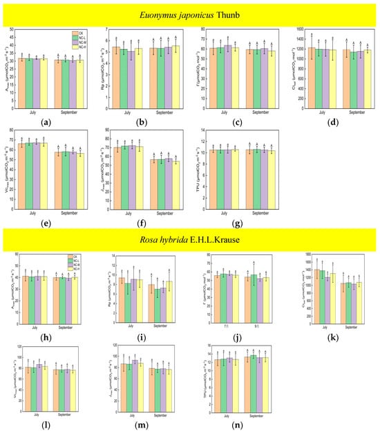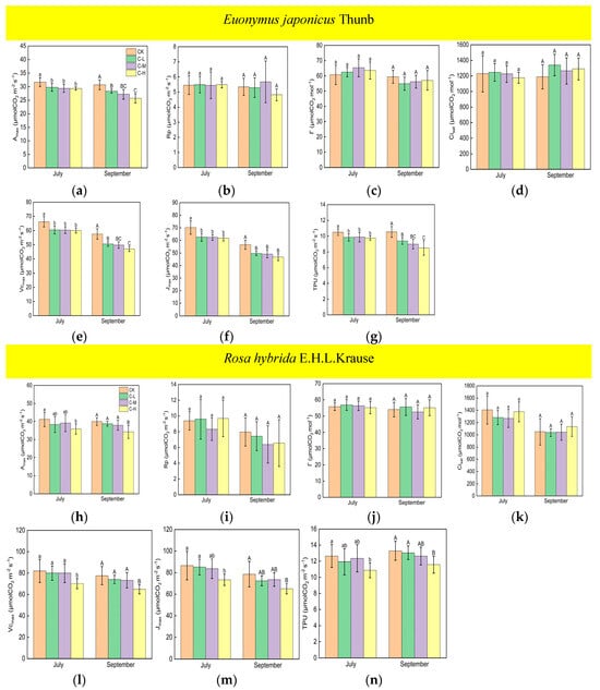 Effects of light intensity on Amax, Rp, Г, Cisat, Vcmax, Jmax, and TPU of Euonymus japonicus Thunb (a–g) and Rosa hybrida E.H.L.Krause (h–n) under non-continuous ALAN. Different lowercase and capital letters within the columns indicate significant differences among the treatments at p < 0.05 in July and September, respectively. Data are mean values ± SDs (n = 6).