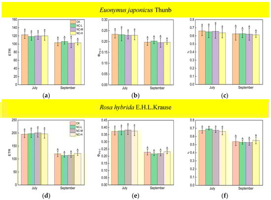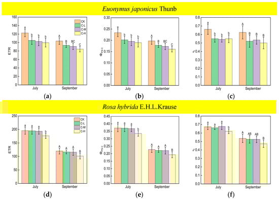Effects of light intensity on the ETR, ΦPSII, and qp of Euonymus japonicus Thunb (a–c) and Rosa hybrida E.H.L.Krause (d–f) under continuous ALAN. Different lowercase and capital letters within the columns indicate significant differences among the treatments at p < 0.05 in July and September, respectively. Data are mean values ± SDs (n = 6).
