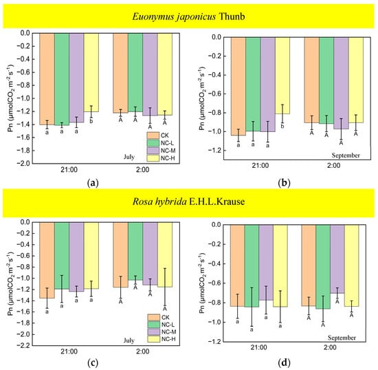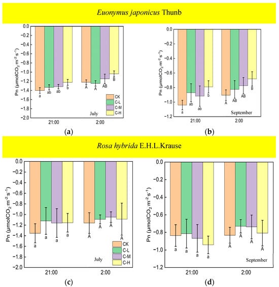 Effects of light intensity on the Pn at night of Euonymus japonicus Thunb (a,b) and Rosa hybrida E.H.L.Krause (c,d) under continuous ALAN. Different lowercase and capital letters within the columns indicate significant differences among the light treatments at p < 0.05 at 21:00 and 2:00, respectively. Data are mean values ± SDs (n = 3).