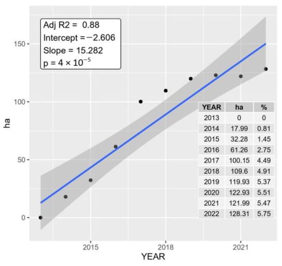 In 2014 and 2015, forest cover loss occurred in relatively small areas throughout the analyzed area (Table 4 and Figure 3). In those years, the maximum area of forest cover loss in terms of fragment level—later referred to as forest glades—did not exceed 1 ha, and this area was quite uniform, as indicated by a low standard deviation. Later, in 2016 and 2017, forest glades emerged in new areas, while existent areas spread out, mainly in the west and northwest, which was particularly evident in 2017 (Figure 3). The mean area of forest glades was almost identical to those from 2014 and 2015, although the maximum area nearly doubled (Table 4). Moreover, the spread of existing forest glades continued in the western and northwestern parts of the research area (Table 5), which was confirmed by the increased standard deviation. The 2018 results are particularly interesting, as the maximum area of forest glades and standard deviation nearly doubled compared to the previous year (Table 4). The spread of existing forest glades continued in the mentioned areas (Figure 3), while its area increase, as indicated by mean, maximum, and standard deviation values, was the largest in the observed period (Table 4). Interestingly, the results of 2019, 2020, 2021, and 2022 do not significantly differ from 2018 (Table 4), as only a small number of forest glades emerged across the analyzed area, including a small-scale continuous spread of existing glades in the west, northwest, and northeast, which gradually increased until the end of the observed period (Figure 3, Table 4).