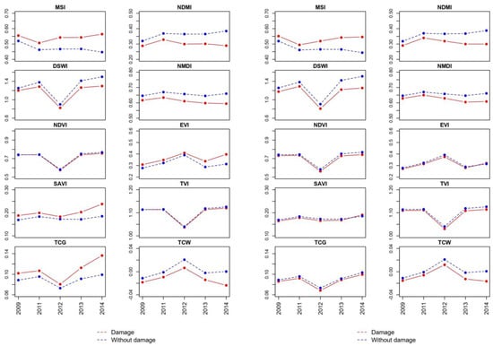 Regardless of drought, the values of other VIs, such as the MSI, NDMI, and NMDI, remained almost constant across all years analyzed. On the other hand, for all VIs used, responses to drought occurring during 2011 were non-existent. As for the post-drought period (2013–2014), the values of VIs regained the pre-drought state.