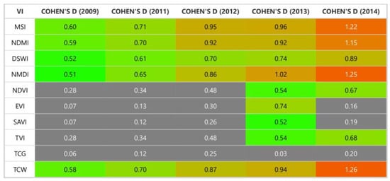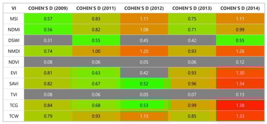 The analysis results of the post-drought period (2013–2014) are quite interesting, as contrary to the drought period, the MSI and NDMI now have a medium effect, while the EVI, SAVI, TCG, and TCW have a large effect in predicting the spatial distribution of forest and non-forest cover (forest cover loss) in 2015. The strength of such an effect for the above-mentioned VIs increased to a very large effect (d > 1.20) and reached its peak in 2014. Again, in the same year, the MSI and NDMI showed a large effect in predicting the spatial distribution of forest and non-forest cover (forest cover loss) in 2015.