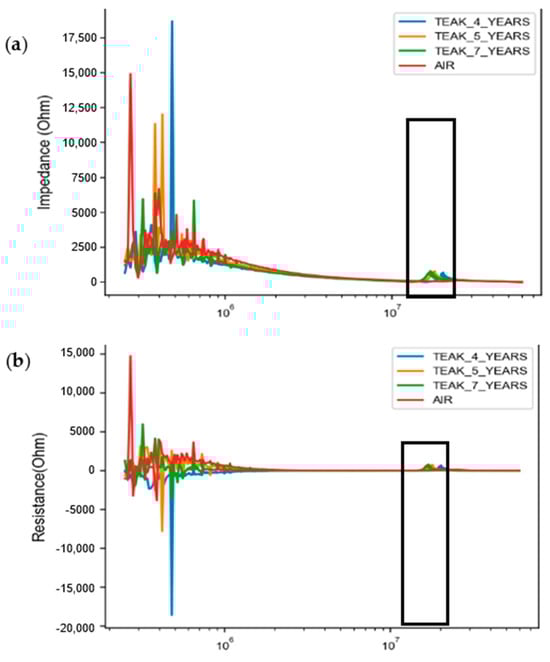 This study explored a wide range of frequencies to identify the optimal dielectric frequency capable of distinguishing wood mass from air based on impedance, resistance, and capacitance properties. It is anticipated that the dielectric value spectra for standing trees and air will display different shapes owing to their distinct permittivities. Permittivity describes the effect of a material on the electric field in reaction with an electric charge. Air, having a lower permittivity compared with solid materials such as wood—and, notably, fresh tree wood, with its high water content (since water possesses a significantly high permittivity) [37]—was chosen as the control for this study. Given the lower permittivity of air, the spectrum is expected to reveal a distinct separation from other media, in this case, wood (teak trees). Thus, spectrum analysis is crucial for identifying the unique peaks that delineate the characteristics of teak wood.