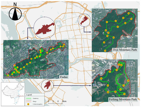 Located on the East China Sea coast, Fuzhou is the capital of Fujian Province, with a population of more than 8.4 million people, and it has a massive demand for urban recreational space. Fuzhou emphasizes constructing an “urban slow walking system” and an “urban community ten-minute fitness circle”. In this study, three typical urban green spaces were selected as case study sites, namely, Fuzhou Urban Forest Trail (“Fu Dao”), Jinji Mountain Park City View Trail (“Jinji Mountain Trail”), and Feifeng Mountain Olympic Park Health Trail (“Feifeng Mountain Trail”) (Figure 1). All three greenways are characterized by free access, abundant space, and high foot traffic; they also differ in size, location, and environment and cover Fuzhou’s main types of greenways. Fudao, with a length of 19 km, is located in the center of the city and is a crown forest trail; Jinji Mountain Trail has a length of 3.4 km, is located in the center of urban traffic, and provides an overview of the city forest trail; Feifeng Mountain Trail, with a length of 4.2 km, is located on the outskirts of the city. It is a wetland forest trail, and the trail weaves around the mountain, the lake, and the buildings. The selected measurement points meet the accessibility and typical characteristics to ensure the correct functional space, landscape, and spatial scale differences; to ensure that the spacing between two adjacent measurement points is more significant than 100 m; to ensure that the spatial distribution is relatively uniform; and to ensure that the specific locations of the measurement points are correct, as in Figure 1.