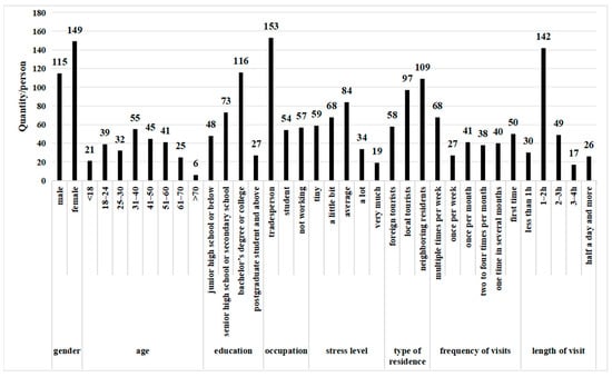 The questionnaire for this study was conducted in three selected urban greenway areas. The questionnaire was designed to be divided into three main sections (Supplementary Materials, File S1), the first of which was a survey of the respondents’ basic information related to gender (male and female), age (<18, 18–24, 25–30, 31–40, 41–50, 51–60, 61–70, and >70 years of age), educational attainment (junior high school or below, senior high school or secondary school, bachelor’s degree or college, and postgraduate student and above), occupation (tradesperson, student, not working), whether they feel stress in their lives (tiny, a little bit, average, a lot, very much), type of residence (foreign tourists, local tourists, neighboring residents), frequency of visits (multiple times per week, once per week, once per month, two to four times per month, one time in several months, first time), and length of visit (less than 1 h, 1–2 h, 2–3 h, 3–4 h, half a day, and more). The statistical information of the survey results is shown in Figure 2.