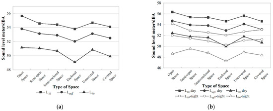 Analysis of acoustic indicators of different types of landscape spaces in urban greenways. Notes: (a) indicates the analysis of acoustic indicators for the whole day without day and night; (b) indicates the analysis of acoustic indicators by day and night.