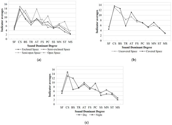 The analysis of the dominant degree of sound sources in different types of landscape spaces is shown in Figure 4. Among the different enclosure types (Figure 4a), the sound source with the highest dominance degree in the enclosed and semi-enclosed spaces was the cicada sound; in the semi-open space, the birdsong was the sound source with the highest dominance degree. In the enclosed, semi-enclosed, and semi-open spaces, the dominance of natural sounds (cicada and birdsong) was higher than that of artificial and mechanical sounds. In open spaces, cicadas and talking sounds were the most dominant sound sources; children’s play and traffic sounds were much more prevalent than in other types of spaces. In different cover types (Figure 4b), cicadas were the most dominant sound source, and cicada and bird sounds were more prevalent than artificial and mechanical sounds. Overall, the dominance of sound sources in covered spaces was higher than in uncovered ones. Comparing each space in the enclosure type and the coverage type, in the enclosure type, sound sources in open and semi-open spaces had the highest degree of dominance; in the coverage type, the supremacy of sound sources in covered spaces was higher. Looking at different times of day (Figure 4c), cicadas were the sound source with the highest dominance, and both natural and artificial sounds had higher dominance than mechanical sounds. The day–night differences between the various types of sound sources were minor. Still, it is worth noting that the day–night differences between birdsong and children’s playfulness were significant in that the dominance of birdsong was higher in the daytime than in the nighttime, and the predominance of children’s playful sounds was higher at night than during the day.