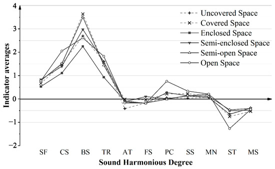 The characterization of sound source harmony perception is shown in Figure 5. From a general point of view, the harmonic characteristics of each sound source in each type of space were similar, and the harmonics of natural sounds were higher than those of artificial and mechanical sounds. The sounds of birdsong, cicadas, and wind blowing on leaves were the three sound sources with the highest harmony ratings among the multiple sound sources. In contrast, the sounds of conversation, traffic, and machines had the lowest harmony ratings. Comparing the various types of spaces, the harmony of traffic sound (SHD = −1.2694) was the weakest in the open space, and the harmony of cicadas (SHD = 2.6152), birdsong (SHD = 2.0537), and windblown leaves (SHD = 1.8255) was the highest. Birdsong sound harmony (SHD = 2.2510) was the highest, and traffic sound harmony (SHD = −0.5033) was the lowest in the enclosure space, indicating that space with a taller enclosure amplifies the effect of sound on people and increases their preference for sound. Regarding sound source type, natural sound harmony was the highest, and mechanical sound harmony was the lowest. The harmony of sound sources affects tourists’ perceptual preference for sound and tour experience, and natural sounds, such as birdsong, significantly influence soundscape perception. In contrast, artificial sounds, such as mechanical and traffic sounds, had a more significant negative impact [31,44,45].