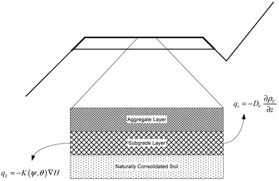 Only two methods allow water to leave the soil in a newly constructed road without vegetation due to lacking transpiration. One is based on the liquid phase of water governed by the Darcy–Buckingham law, and the second is water vapor modeled by Fick’s law (Figure 1). As the road was newly constructed and no roots were seen at any of the sites, we assumed there was no transpiration in the subgrade during this study.