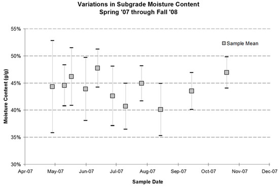 This literature review investigates the reduction in the subgrade strength of fine-grained soils when used in a road’s subgrade, which can lead to environmental damage. There are mixed results regarding how fast these soils dry and the strength of the subgrades improves. Li and Selig [9] describe how moisture in fine-grained soils can reduce the strength and stiffness of subgrade soils. Roslan et al. [10] showed that repeatedly submerging well-graded sandy and silty clay gravelly soils for one hour per day for one, three, and seven days reduced CBR by almost 80% from non-soaked samples [10]. Thus, the impact of moisture content on strength reduction is well known. Lary and Mahoney [11] measured changes in the resilient modulus and moisture content of the subgrades of roads in Oregon and Washington. Their results showed a change varying between 54 and 16 percent from the maximum strengths due to seasonal changes in subgrade moisture. They demonstrated a potential change in soil strength with cycles of drying and wetting.
