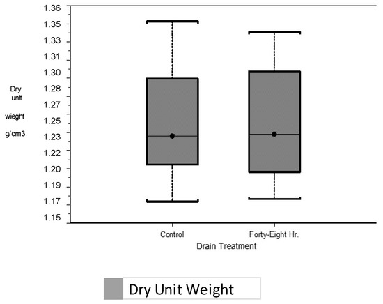 Figure 9 shows the soil samples’ average dry unit weight before testing, which was 378 kg/m2 (77.5 pcf). The statistically insignificant difference (p-value = 0.9848) in densities between the samples tested at 10 min versus those tested at 48 h indicates proper replication used in the experiment.