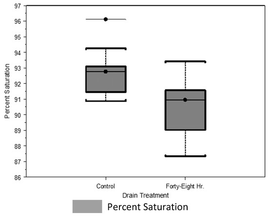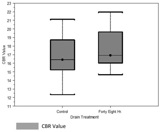 There is a slight reduction in the percent saturation between the control (10 min) and the samples exposed to 48 h of drying at 60.8 kPa (0.6 atmospheres) of suction. The result is a statistically significant difference in the saturation levels between the soil subjected to drying and those tested according to the standard CBR procedure. This decrease is between 93% and 91% saturation. The p-value is 0.0004 (Figure 10). In contrast, the CBR data show no statistically significant difference between the control and the samples exposed to 48 h of drainage at 0.06 atmospheres of suction. The p-value for this comparison is 0.2454 (Figure 11), with both sample populations producing an average CBR value near 16.
