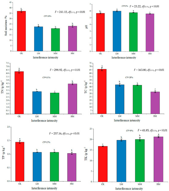 Effects of different levels of disturbance on soil physicochemical properties. TN: total nitrogen; TC: total carbon; TP: total phosphorus; TK: total potassium. Lowercase letters indicate significant differences in the effects of different levels of disturbance on soil physicochemical properties. The figure shows the means ± SD.