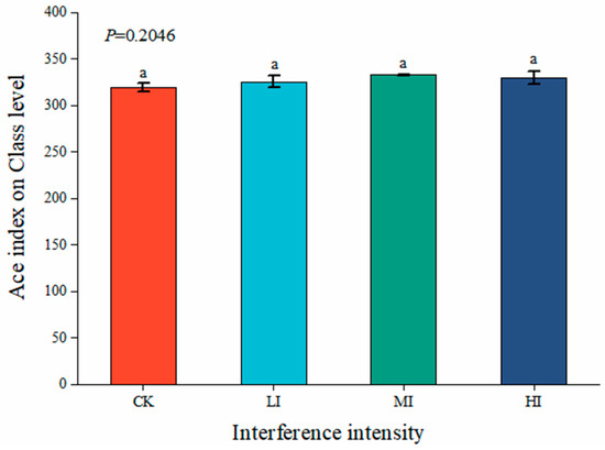 Bar graph of alpha diversity index at different levels of disturbance. Different lowercase letters indicate significant differences between the different sample groups.