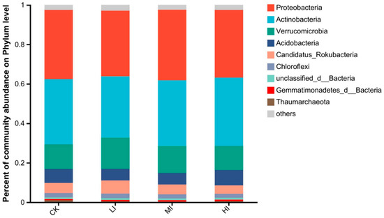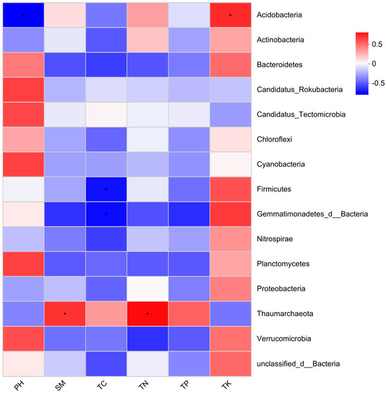 According to the results of high-throughput sequencing, as shown in Figure 3, different disturbance levels increased the biodiversity of the soil microbial community (CK = 319.3, LM = 325.5, MM = 332.5, HM = 329.3); however, these results were not significant (p > 0.05). In soils with different levels of disturbance, Proteobacteria, Actinobacteria, Verrucomicrobia, Acidobacteria, Candidatus_Rokubacteria, Chloroflexi, Gemmatimonadetes, and Thaumarchaeota were the dominant populations, with high abundance (Figure 4). The microbial population with the highest relative abundance was Proteobacteria (0.35, 0.33, 0.35, 0.34), while the second-most dominant population was Actinobacteria (0.33, 0.31, 0.33, 0.35). The medium-intensity group was most similar to the control in terms of soil dominant population composition and relative abundance size. In the low-intensity group, Proteobacteria and Actinobacteria had the lowest relative abundances. The difference in relative abundance between Proteobacteria and Actinobacteria was 0.02 for the control, low-intensity, and medium-intensity groups. The difference in relative abundance between Proteobacteria and Actinobacteria in the high-intensity group was 0.01, which was closer than in the other groups. Proteobacteria was the microbial population with the highest relative abundance. The relative abundances of Bacteroidetes, Tenericutes, and a tentatively unclassified fungus differed significantly (p < 0.05) between sample groups at different levels of disturbance. The relative abundances of Bacteroidetes and Tenericutes increased in soils with different intensities of mortality, compared with control (Figure 5a,b). The relative abundance of Bacteroidetes was significantly higher in the low-intensity group than in the control, while the relative abundance of Tenericutes was significantly higher in the medium-intensity group than in the control. The different intensities of disturbance resulted in a significant decrease in the relative abundance of all tentatively unclassified fungi (Figure 5c). Most of the negative correlations were found between microbial populations and soil moisture content, total carbon, total nitrogen, and total phosphorus content, while most of the positive correlations were found with pH and total potassium content. Acidobacteria showed a significant negative correlation with pH and a significant positive correlation with total potassium content. Thaumarchaeota showed significant positive correlations with soil moisture content and total nitrogen content. Firmicutes and Gemmatimonadetes showed significant negative correlations with total carbon content (Figure 6). PERMANOVA analysis indicated that soil nitrogen content (R2 = 0.15289, p = 0.081) was the key factor driving changes in the microbial community.